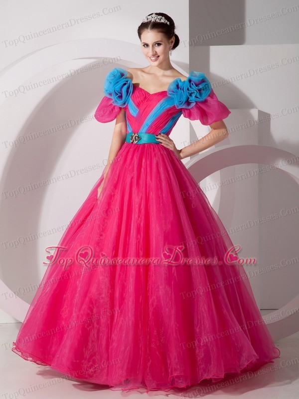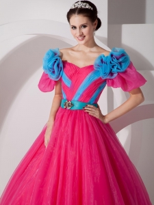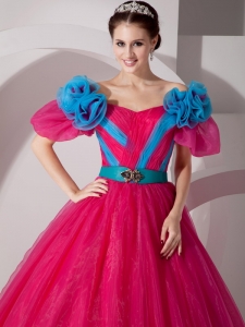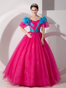 Hot Pink Off The Shoulder Quinceanera Dress Hand Made Flowers