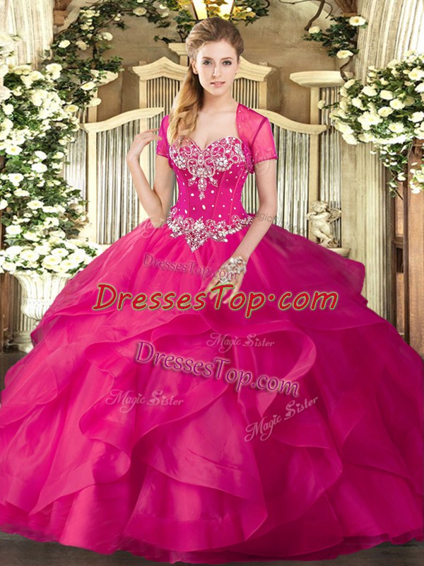 Hot Pink Quinceanera Dress Military Ball and Sweet 16 and Quinceanera with Beading and Ruffles Sweetheart Sleeveless Lace Up