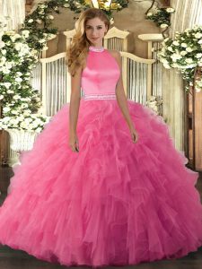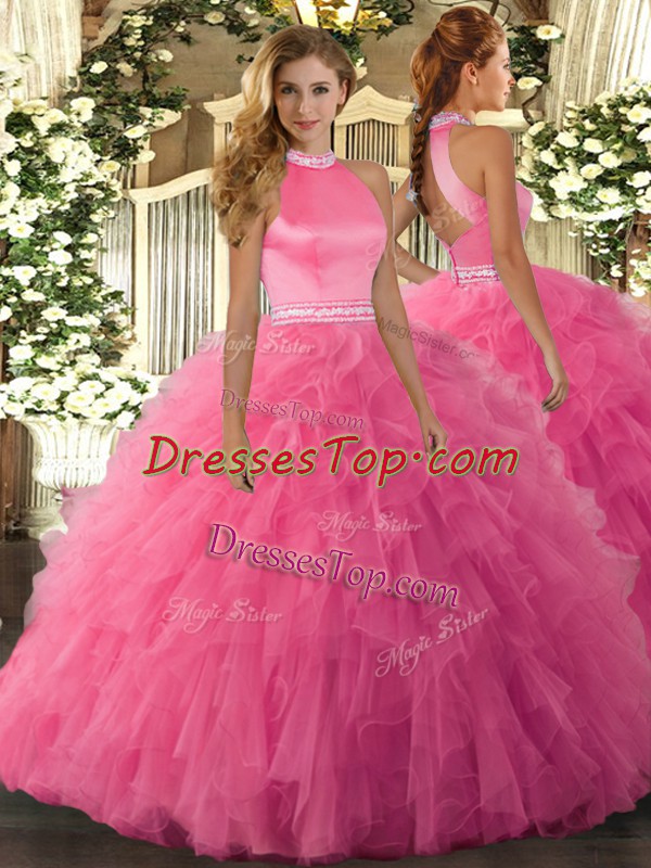 Hot Pink Sleeveless Beading and Ruffles Floor Length 15 Quinceanera Dress