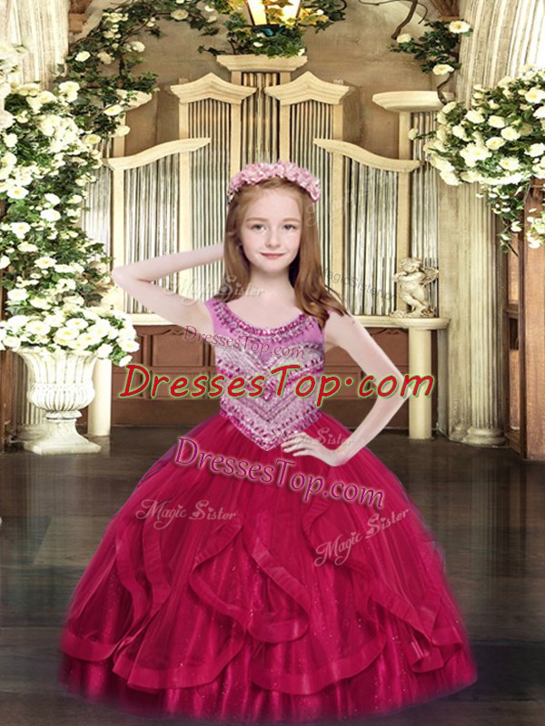 Hot Pink Sleeveless Beading and Ruffles Floor Length Girls Pageant Dresses