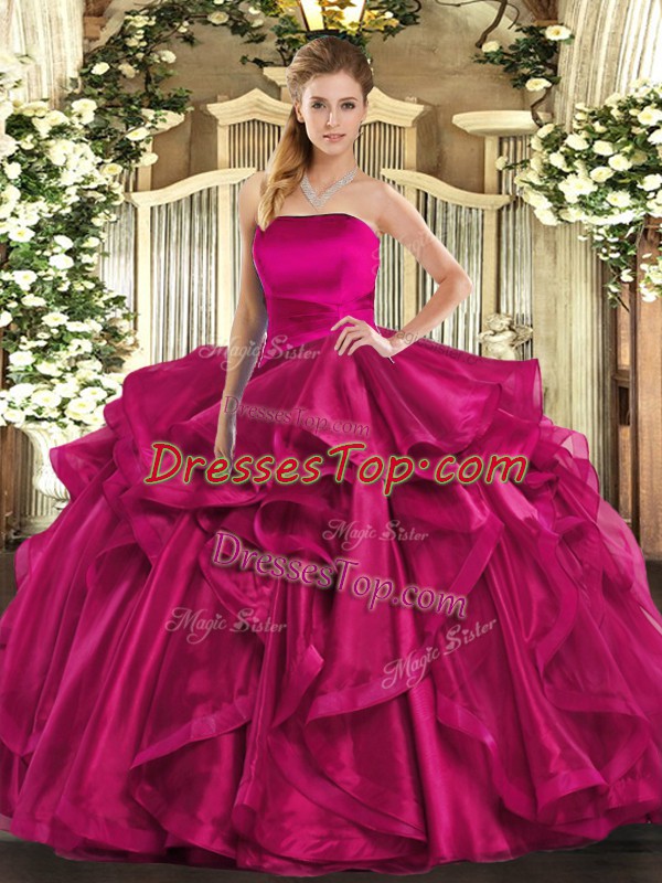 Hot Pink Sleeveless Floor Length Ruffles Lace Up Quinceanera Dresses