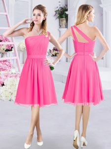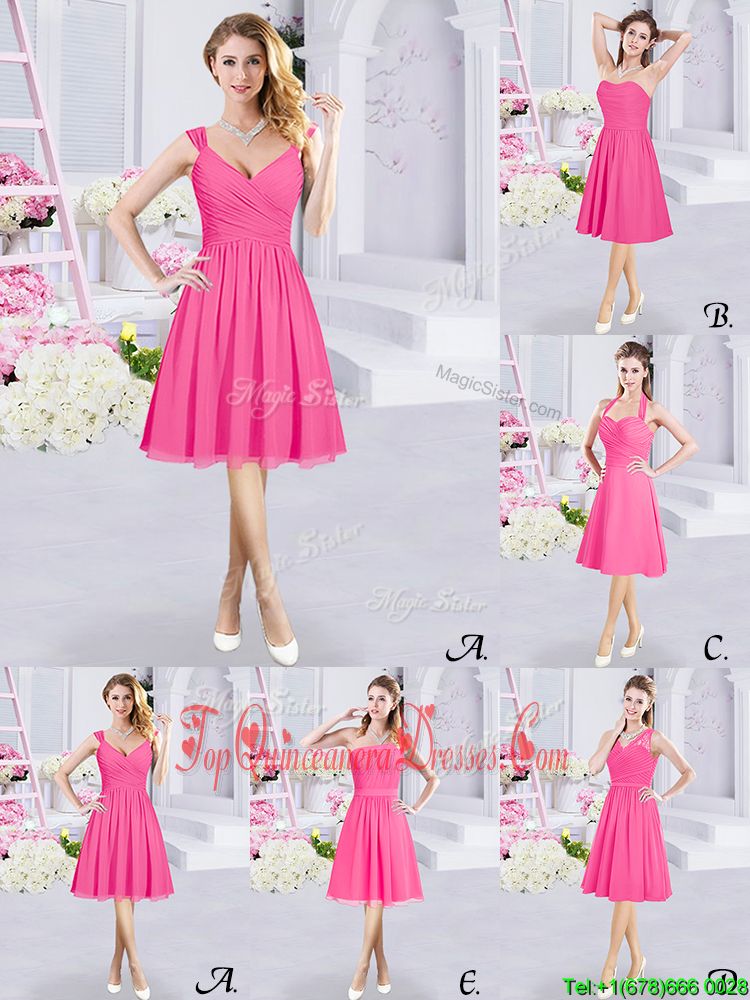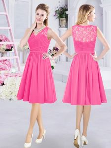 Hot Pink Sleeveless Lace and Ruching and Belt Knee Length Quinceanera Dama Dress
