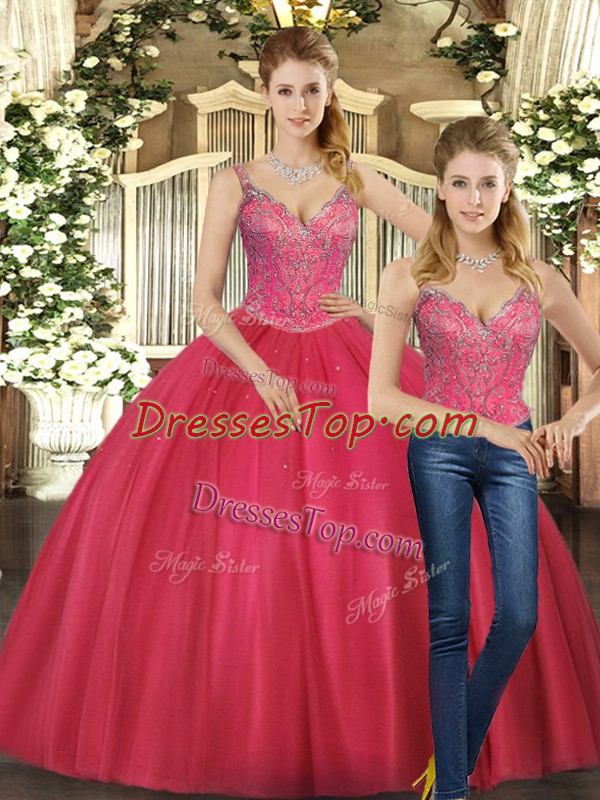 Hot Pink Straps Lace Up Beading Quinceanera Gown Sleeveless