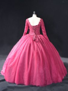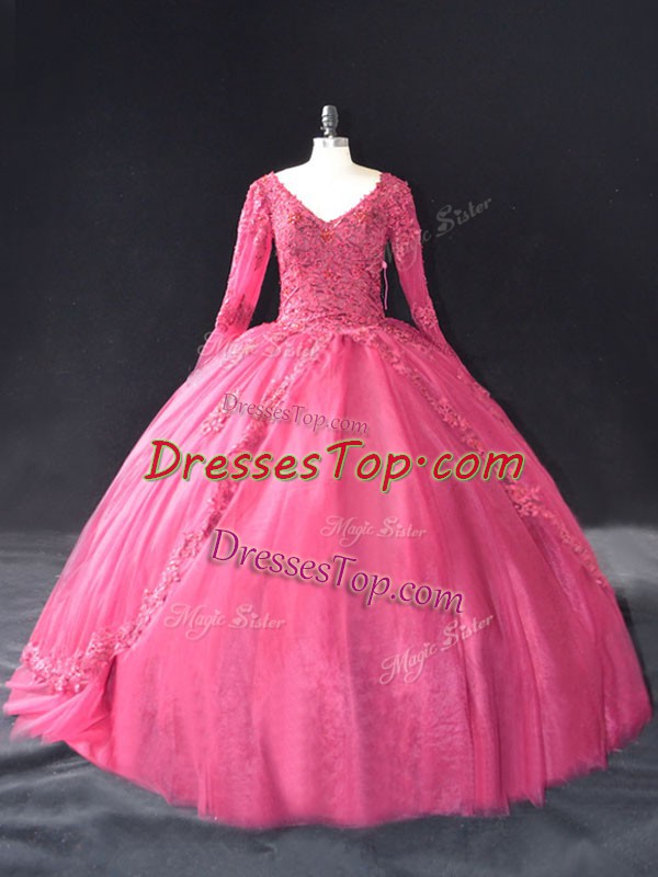 Hot Pink Tulle Lace Up V-neck Long Sleeves Floor Length Sweet 16 Dress Lace and Appliques