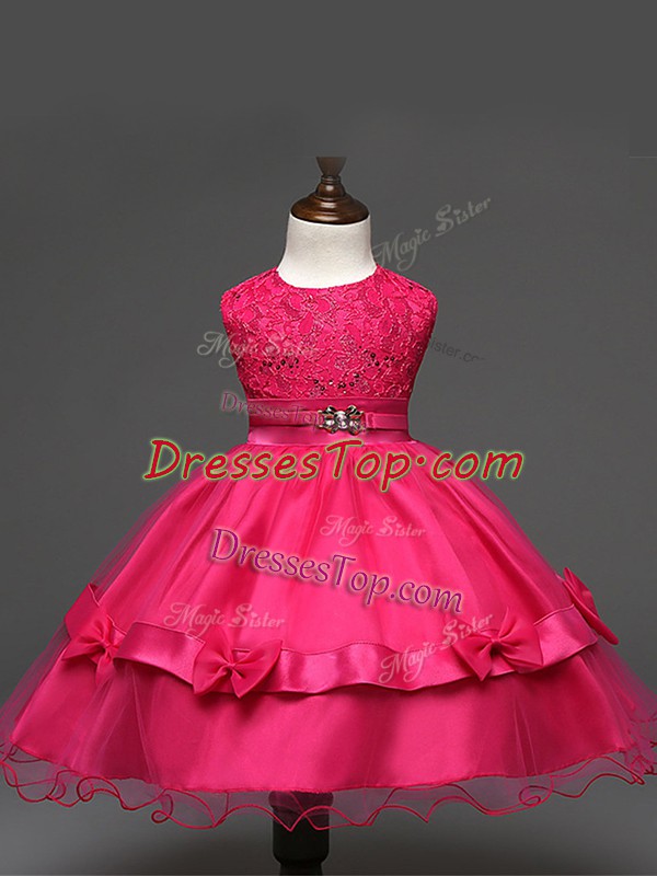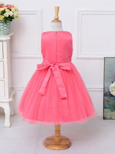 Hot Pink Tulle Zipper Scoop Sleeveless Knee Length Little Girl Pageant Dress Lace and Bowknot