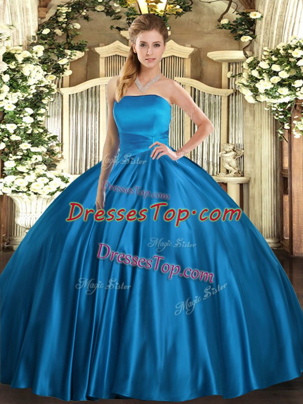 Hot Sale Ball Gowns 15th Birthday Dress Blue Strapless Satin Sleeveless Floor Length Lace Up