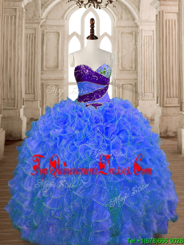Hot Sale Beaded and Ruffled Organza Quinceanera Dress in Blue