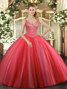 Hot Sale Beading Sweet 16 Dresses Coral Red Lace Up Sleeveless Floor Length
