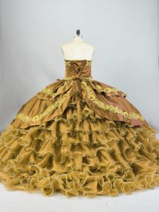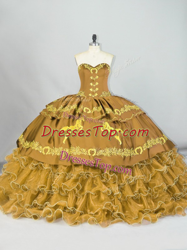 Hot Sale Brown Lace Up Sweetheart Embroidery and Ruffled Layers Quinceanera Dress Satin and Organza Sleeveless Brush Train