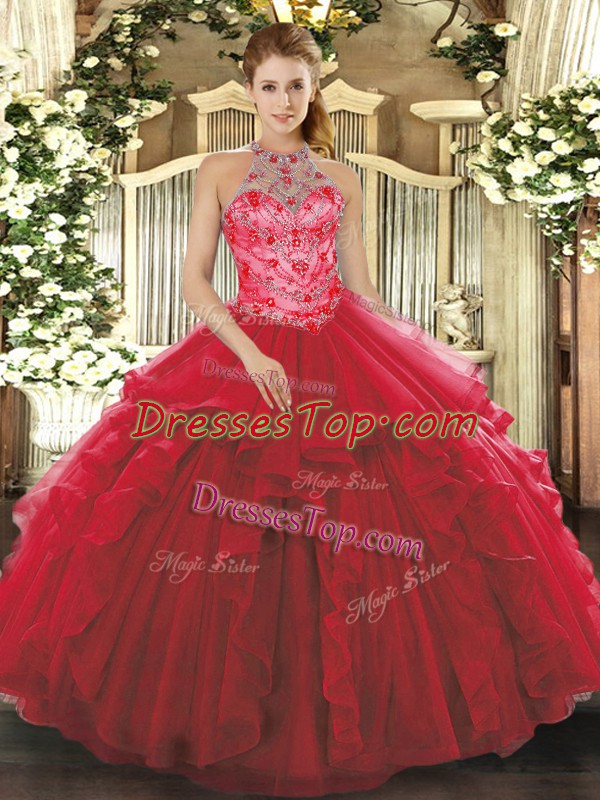 Hot Sale Coral Red Lace Up Halter Top Beading and Embroidery and Ruffles Vestidos de Quinceanera Organza Sleeveless