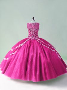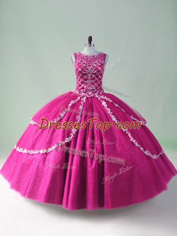 Hot Sale Fuchsia Scoop Neckline Beading and Appliques Quinceanera Gowns Sleeveless Zipper