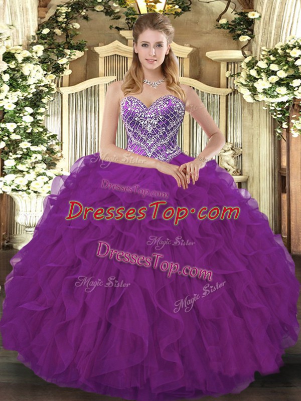 Hot Sale Fuchsia Tulle Lace Up Sweetheart Sleeveless Floor Length Quinceanera Dress Beading and Ruffled Layers