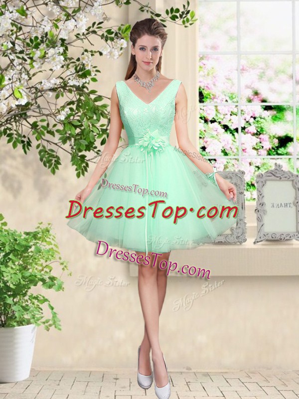 Hot Sale Knee Length Apple Green Damas Dress V-neck Sleeveless Lace Up