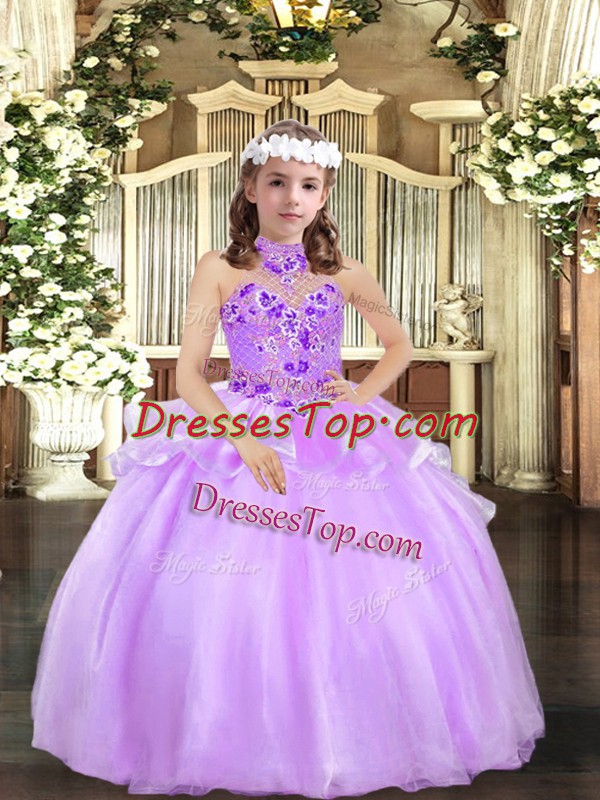 Hot Sale Lavender Halter Top Lace Up Appliques Little Girls Pageant Dress Sleeveless