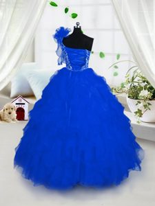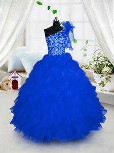 Hot Sale One Shoulder Sleeveless Organza Floor Length Lace Up Kids Pageant Dress in Royal Blue for with Embroidery and Ruffles