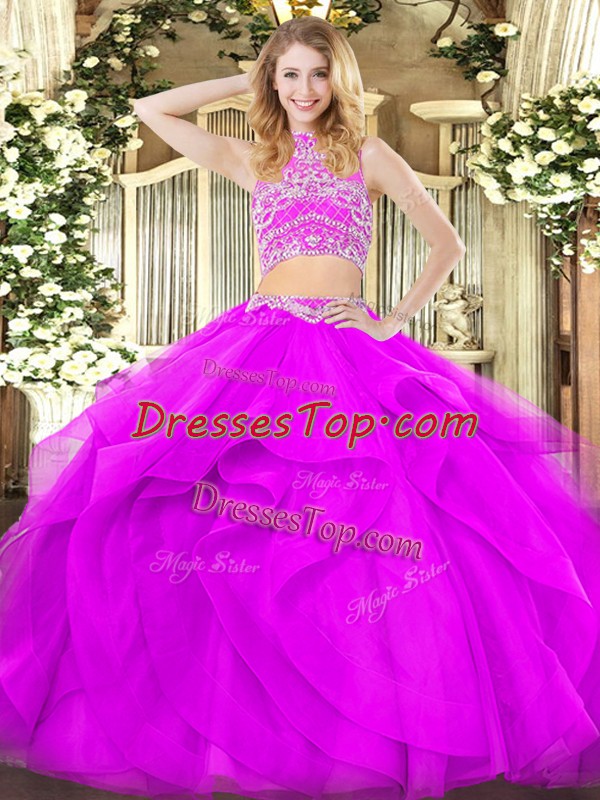 Hot Sale Purple High-neck Neckline Beading and Ruffles 15th Birthday Dress Sleeveless Backless