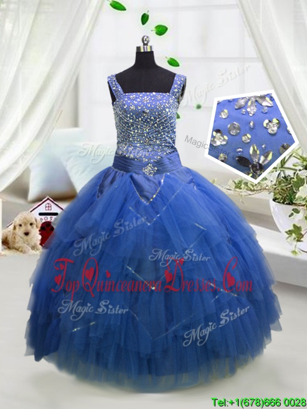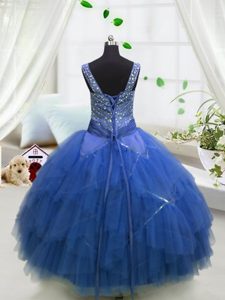 Hot Sale Royal Blue Tulle Lace Up Little Girls Pageant Dress Wholesale Sleeveless Floor Length Beading and Ruffles