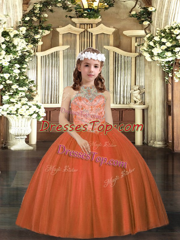 Hot Sale Rust Red Ball Gowns Tulle Halter Top Sleeveless Beading Floor Length Lace Up Little Girls Pageant Gowns