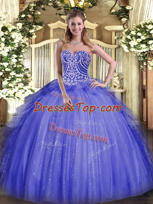 Hot Sale Sweetheart Sleeveless Sweet 16 Dress Floor Length Beading and Ruffles Blue Organza