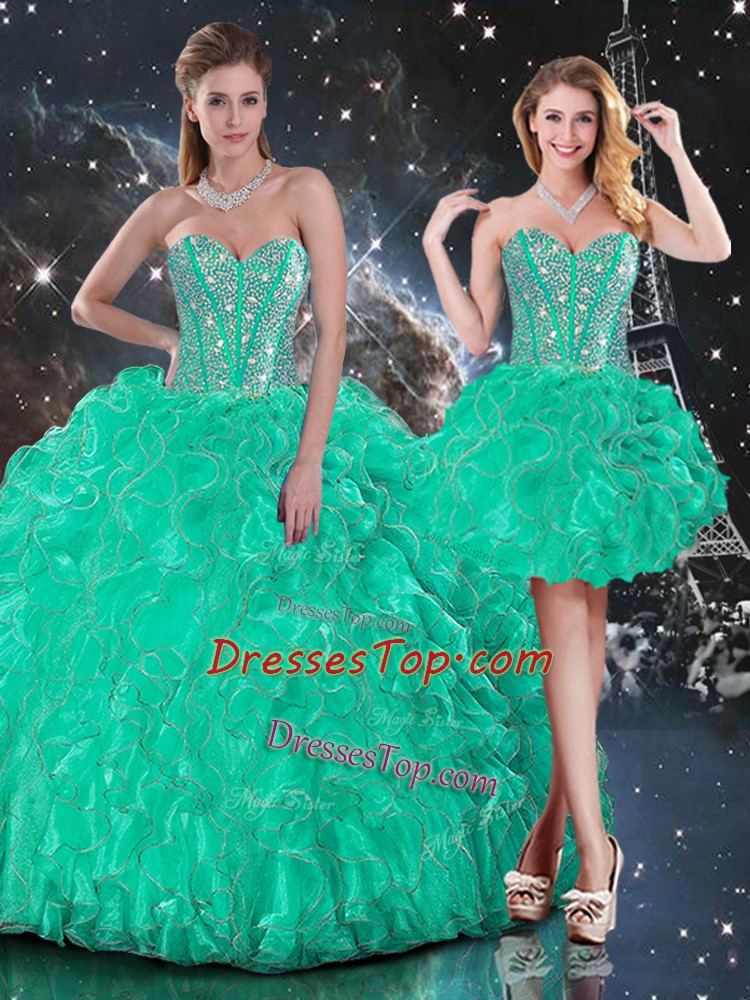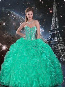 Hot Sale Turquoise Lace Up Sweetheart Beading and Ruffles Ball Gown Prom Dress Organza Sleeveless