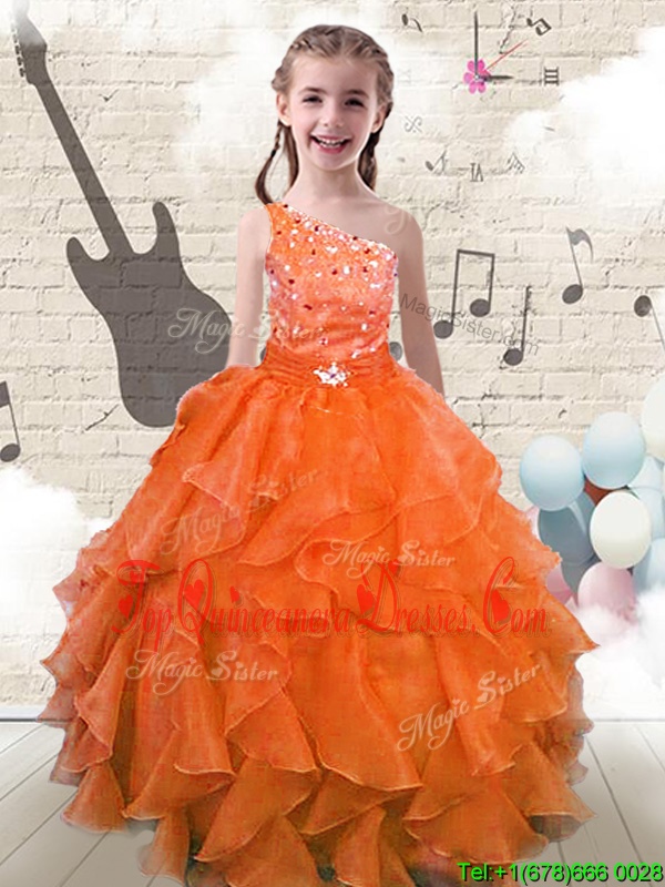 Hot Selling Ball Gowns Little Girls Pageant Dress Wholesale Orange Red One Shoulder Organza Sleeveless Floor Length Lace Up