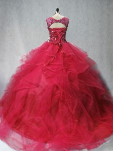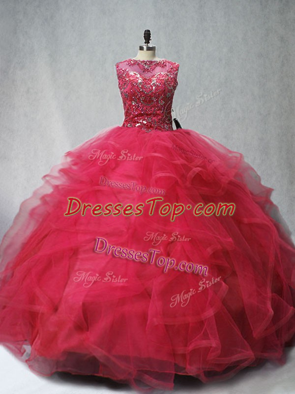 Hot Selling Ball Gowns Sleeveless Coral Red Quinceanera Gown Brush Train Lace Up