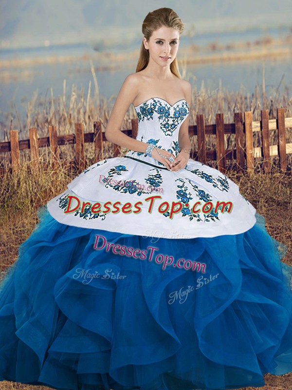 Hot Selling Blue And White Lace Up Quinceanera Gowns Embroidery and Ruffles and Bowknot Sleeveless Floor Length