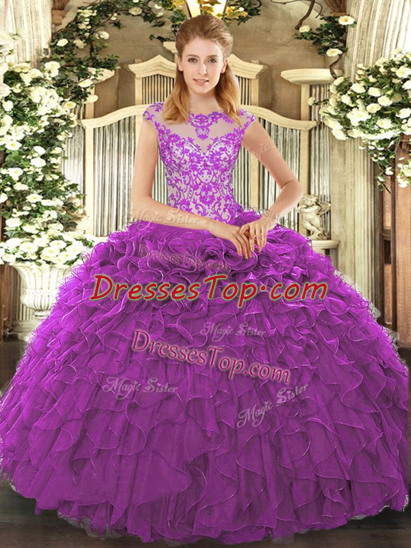 Hot Selling Eggplant Purple Cap Sleeves Floor Length Beading and Appliques and Ruffles Lace Up Quinceanera Dresses