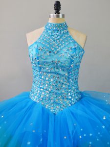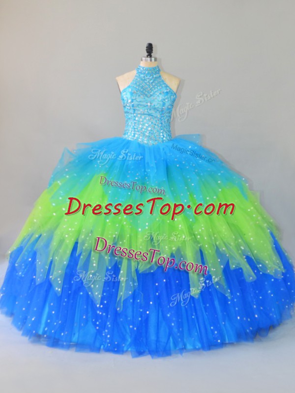 Hot Selling Multi-color Tulle Lace Up Halter Top Sleeveless Floor Length Vestidos de Quinceanera Beading and Ruffles