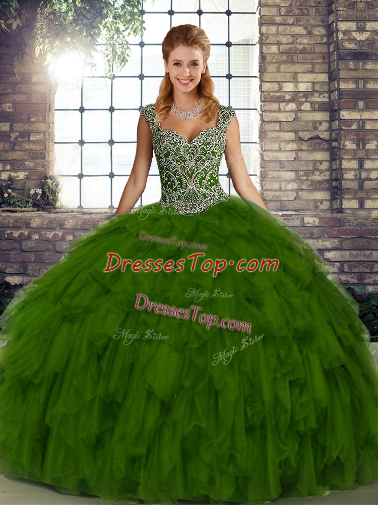 Hot Selling Olive Green Organza Lace Up Sweet 16 Quinceanera Dress Sleeveless Floor Length Beading and Ruffles