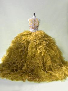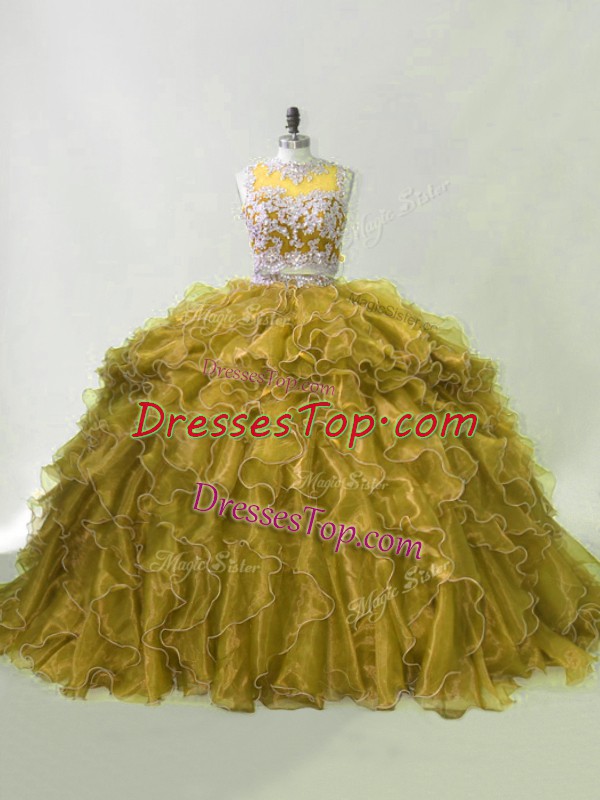 Hot Selling Olive Green Organza Zipper Quinceanera Gown Sleeveless Brush Train Beading and Ruffles