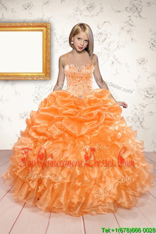 Hot Selling Orange Spaghetti Straps Neckline Beading and Ruffles and Pick Ups Little Girls Pageant Gowns Sleeveless Lace Up