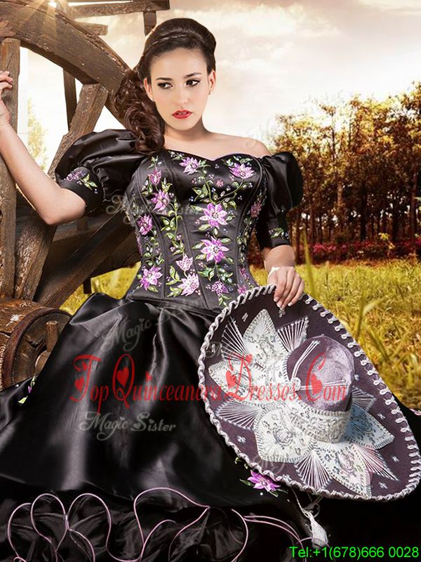 Hot Selling Organza and Taffeta Off The Shoulder Short Sleeves Lace Up Embroidery and Ruffles Quinceanera Gowns in Black