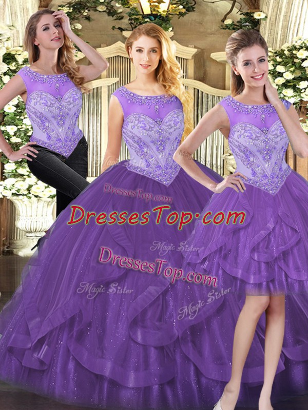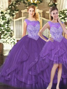 Hot Selling Purple Scoop Neckline Beading and Ruffles Quince Ball Gowns Sleeveless Zipper