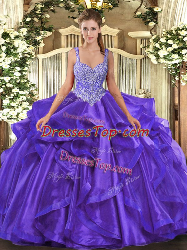 Hot Selling Sleeveless Organza Floor Length Lace Up 15 Quinceanera Dress in Purple with Beading and Ruffles