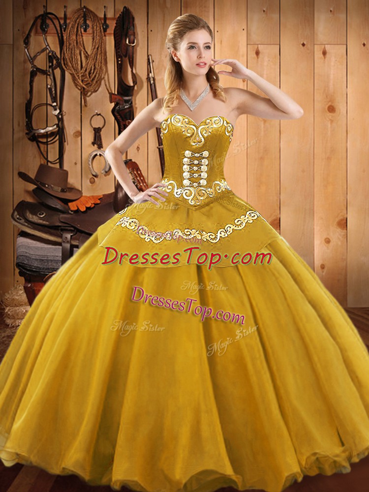 Hot Selling Sleeveless Satin and Tulle Floor Length Lace Up Quinceanera Gown in Gold with Embroidery