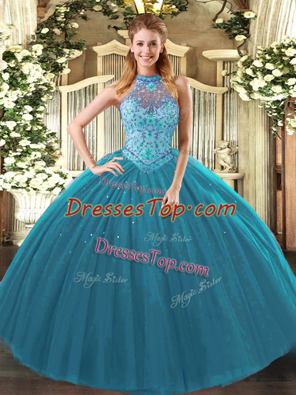 Hot Selling Teal Sleeveless Tulle Lace Up Quince Ball Gowns for Sweet 16 and Quinceanera
