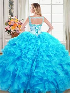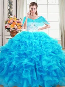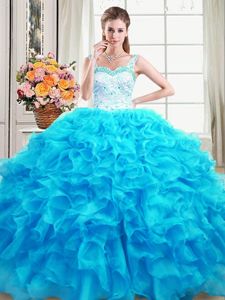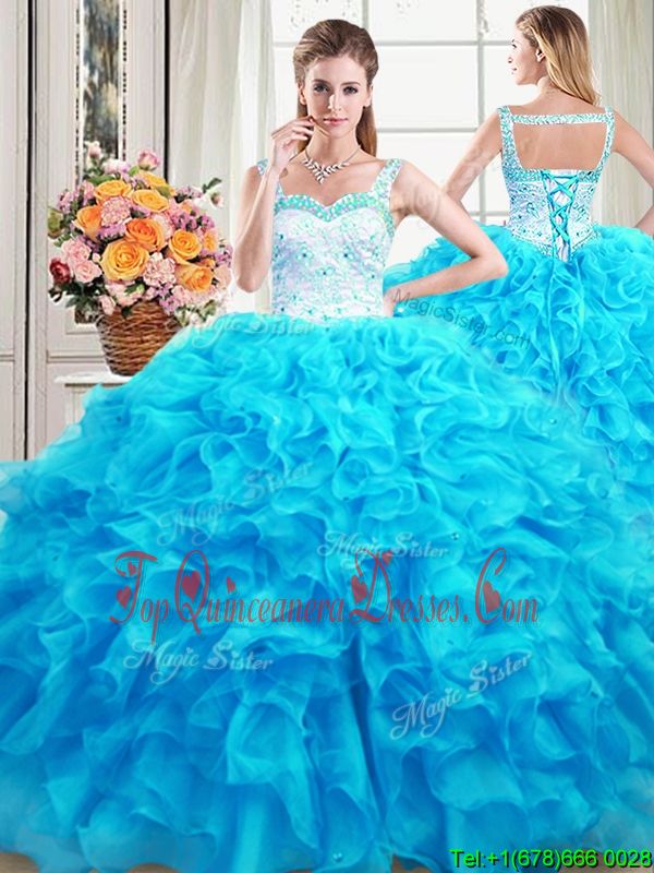 Hot Selling Three Piece White and Blue Ball Gowns Organza Sweetheart Sleeveless Beading and Ruffles Floor Length Lace Up Quince Ball Gowns