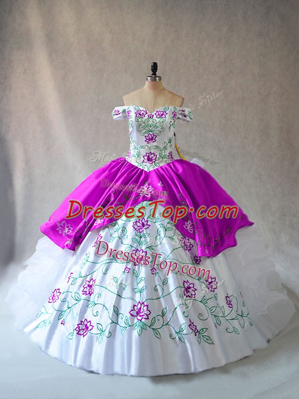 Hot Selling White And Purple Ball Gowns Off The Shoulder Sleeveless Organza Floor Length Lace Up Embroidery and Ruffles Sweet 16 Quinceanera Dress