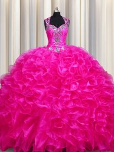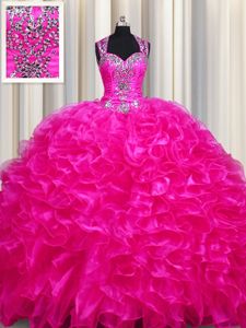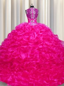 Hot Selling Zipper Up See Through Back Sleeveless With Train Beading and Ruffles Zipper Quinceanera Gowns with Fuchsia Sweep Train