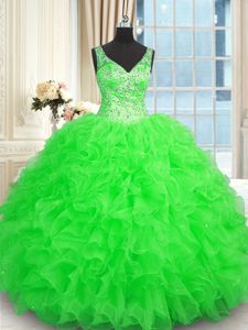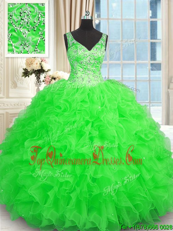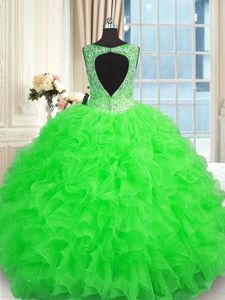Ideal Green Organza Zipper Quinceanera Gowns Sleeveless Floor Length Beading and Ruffles