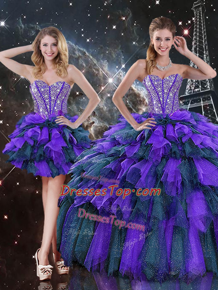 Ideal Multi-color Ball Gowns Organza Sweetheart Sleeveless Beading and Ruffles and Ruffled Layers Floor Length Lace Up Sweet 16 Dress