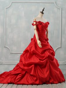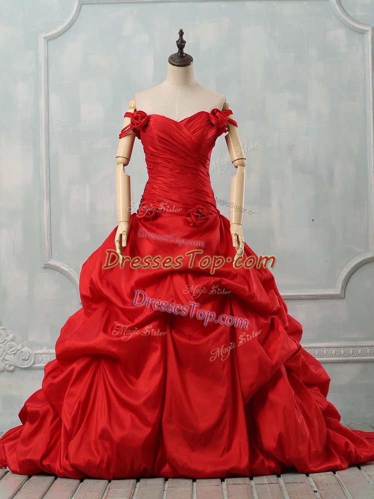 Ideal Off The Shoulder Sleeveless Taffeta Sweet 16 Quinceanera Dress Pick Ups and Hand Made Flower Court Train Lace Up