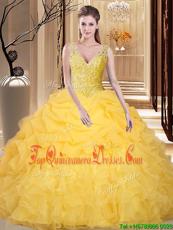 Ideal Pick Ups Gold Sleeveless Organza Backless 15 Quinceanera Dress for Military Ball and Sweet 16 and Quinceanera