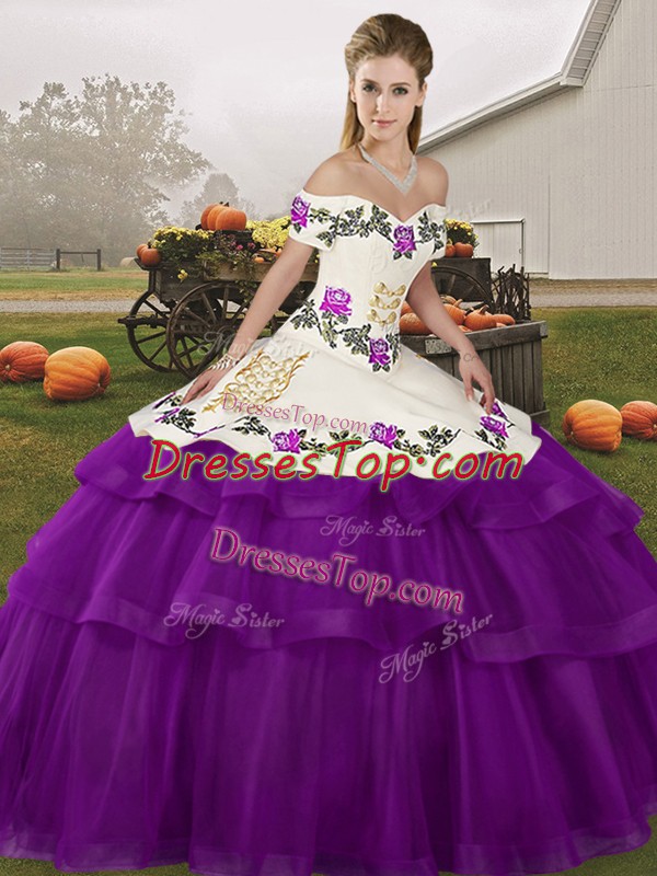 Ideal Purple Sleeveless Brush Train Embroidery and Ruffled Layers Quinceanera Gown
