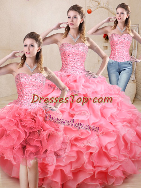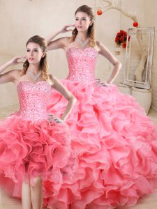 Ideal Watermelon Red Lace Up Sweetheart Beading and Ruffles Sweet 16 Dresses Organza Sleeveless