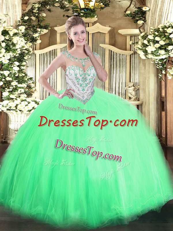Inexpensive Apple Green Ball Gowns Beading Quince Ball Gowns Zipper Tulle Sleeveless Floor Length