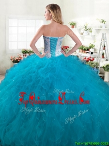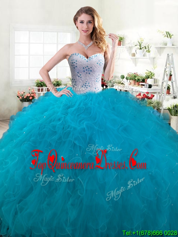 Inexpensive Beaded and Ruffled Big Puffy Quinceanera Dress in Teal