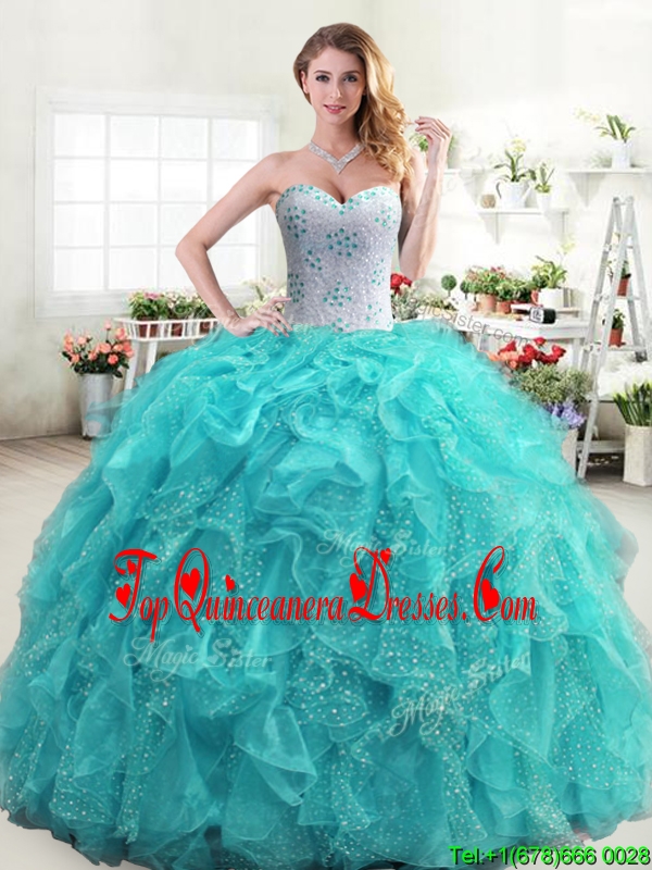 Inexpensive Beaded and Ruffled Turquoise Quinceanera Dress in Organza