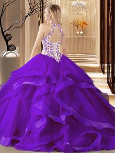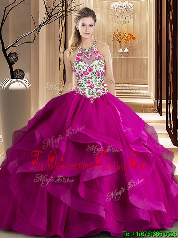 Inexpensive Brush Train Ball Gowns 15 Quinceanera Dress Fuchsia Scoop Tulle Sleeveless Zipper